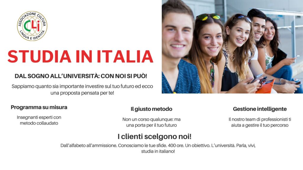 In Italia, le università riservano dei posti per studenti stranieri, sia comunitari che non comunitari, sia per i corsi di laurea che per i corsi di laurea magistrale. Gli studenti non comunitari che desiderano studiare in Italia possono accedere ai corsi di laurea affrontando procedure di ammissione specifiche, che potrebbero includere il superamento di test di ammissione (se previsto), e chiaramente la conoscenza della lingua italiana. Il nostro è un corso intensivo collaudato e finalizzato al raggiungimento di questo obbiettivo.